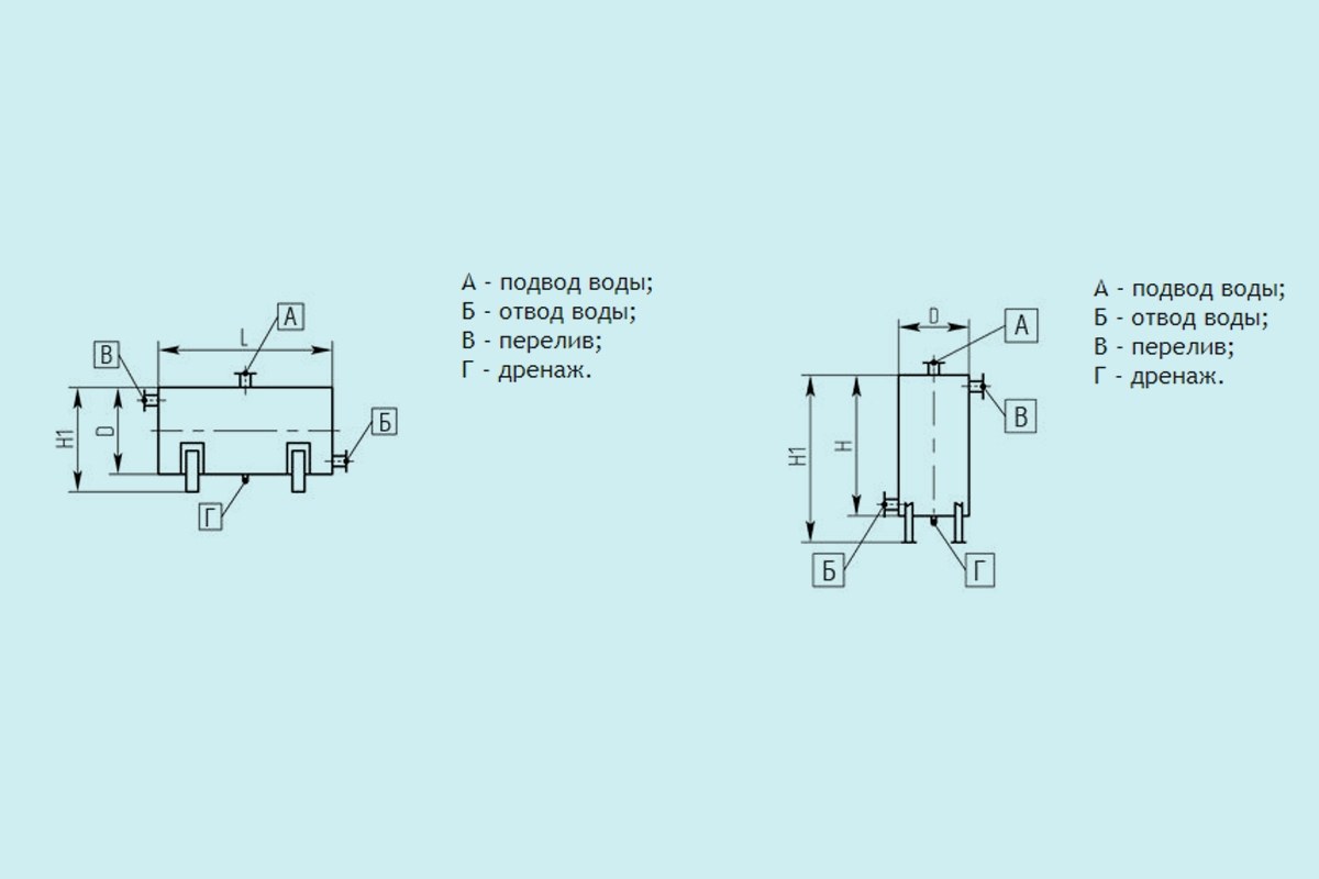 Рисунок. Водяные баки вертикального и горизонтального типа.