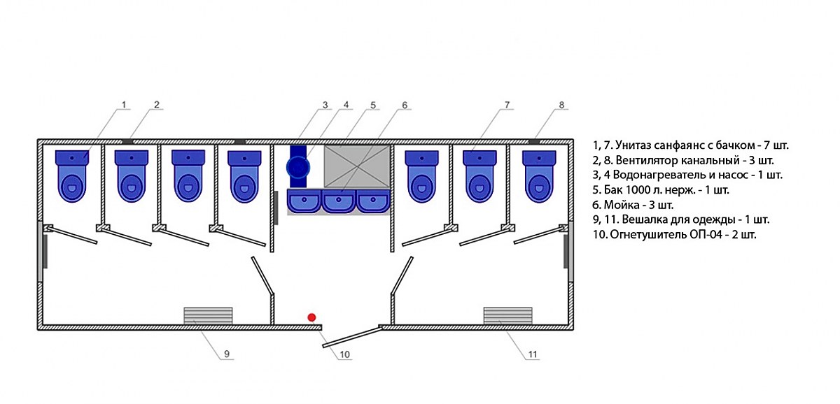 Укомплектованные вагон-дома санузлы размером 8000х2500 мм разработаны для использования на удаленных от коммуникаций объектов. Их особенностью следует считать грамотную внутреннюю организацию пространства, использование оптимального количества кабинок с необходимым сантехническим оборудованием. Заказать такие мобильные вагон-дома предлагаем от Завода Резервуаров и Негабаритных Металлоконструкций. Доставляем конструкции в любой регион России.
